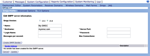 Changes to an active SMSC: you can change parameters and add short codes of active SMSCs (including the defaults SMSC). When an SMSC is saved, the new values will take place in the SMS Sender/SMS Receiver after approximately a minute (there is no system parameter to control how long after the cache is updated by the components, the value is hard coded as 60 seconds). Please note that you cannot change the name, host name, port, login name and password of an active SMSC.
