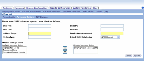 By default, advanced options will be empty. If the SMSC expects a value for one of the options, administrators should set the right value in Connect. Once they make changes to the connection properties, the SMPP Sender will let the current connections complete their actions and then drop the connections to make room for new connections that will use the new properties.