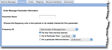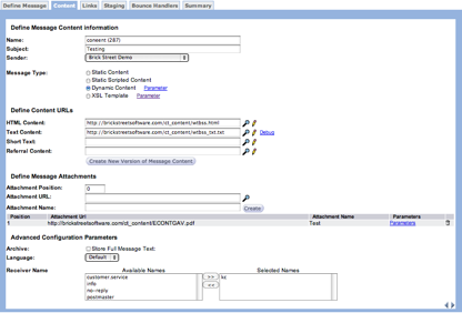 This page is similar to the page where you choose message parameters for dynamic content. However, for XSLT content, the message parameter names cannot contain white space. For example, if you choose the First Name customer attribute, you must spell the message parameter FirstName or First_Name.