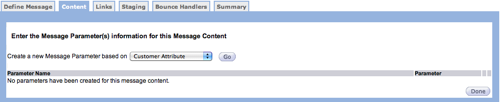 When you click the Parameter link, Connect displays the Message Parameter(s) window. This window shows you the currently selected parameters to pass to the content generator. Here you can edit, delete, or add message body parameters.