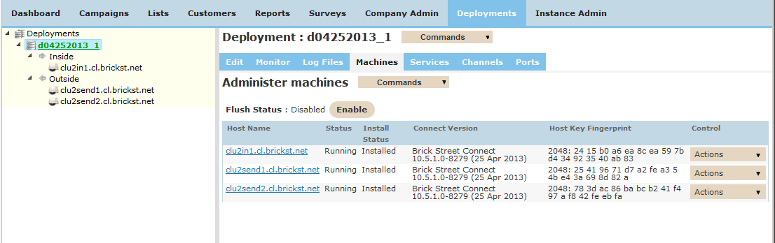 To enable a send handler for the deployment, check the box and click Update. The Connect UI will update the deployment configuration stored on each node. Then go back to the Machines tab and restart the deployed nodes.
