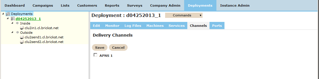 Make sure all nodes in the deployment are shut down. The click the Channels tab in the deployment. You will see a list of delivery channels and checkboxes indicating whether they are enabled for the current deployment.